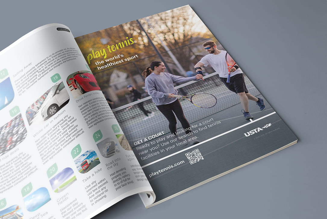 The World’s Healthiest Sport” was a nation wide campaign promoting tennis for physical and mental wellbeing. The campaign featured billboards, signage, banners, print and digital advertisements, and social media content deployed across high-traffic areas, tennis clubs, and community centers. Static assets including postcards, posters, pop-up banners, and branded merchandise were distributed at grassroots events and tournaments. I created the comprehensive WHS toolkit for consistent implementation across all 17 USTA sections nationwide, providing each region with the resources to celebrate tennis as an accessible, health-promoting sport.